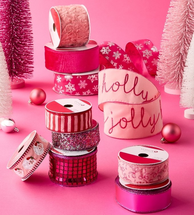 - Pops of Pink: Swap neutrals for bold color. Try the Pink Holographic Foil Premium Gift Wrap, Mini Pink Mix Christmas Bows Set and Pink & Red Stripes Holly Jolly Wired Jumbo Ribbon.