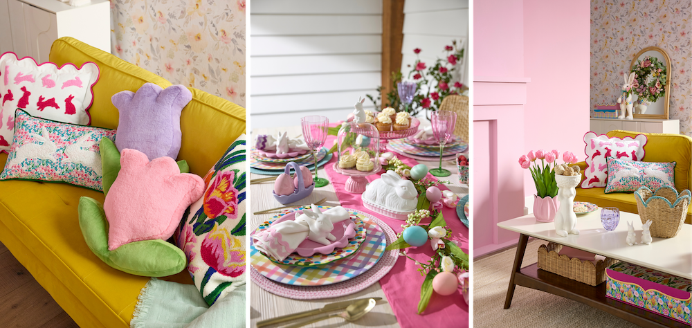 Bunnies & Bloom: A bold, color-forward collection featuring vibrant florals, playful bunny motifs, and festive accents that instantly brighten any room. From tulip pillows and eye-catching tabletop décor to coordinated entertaining essentials, Bunnies in Bloom makes it easy to host a cheerful Easter brunch or egg hunt — without overspending.